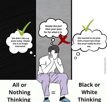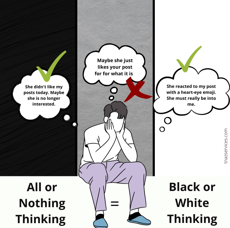 Below are some examples of cognitive distortions, depicted through pictures. Take a moment to guess what each picture is trying to convey about the meaning of that cognitive distortion