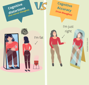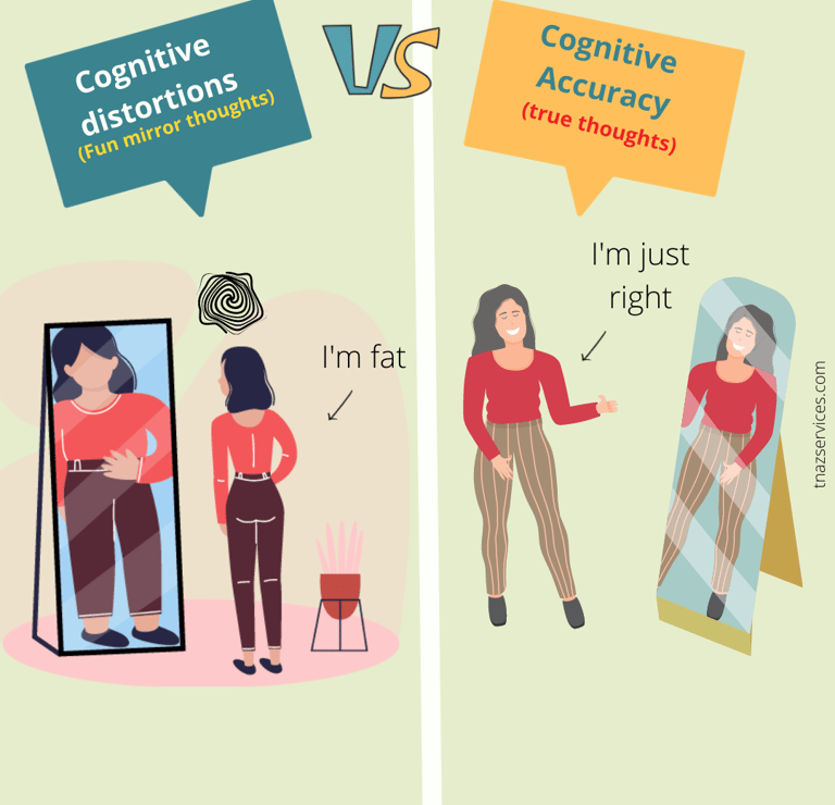 Not all mirrors are created equal. Some have a slight distortion in them (1 or 2 percent), while others have more distortions ( like funhouse mirrors ). Our thoughts are like mirrors. They reflect our reality back to us. When they are balanced and healthy, they offer very little distortions, helping us feel emotionally balanced. But when they are unbalanced and overtly negative, they become like fun mirrors-- distorted and exaggerated. However, we perceive them to be an accurate reflection of our reality which results in emotional distress, sadness, and anxiety.