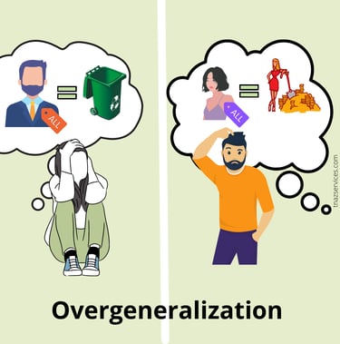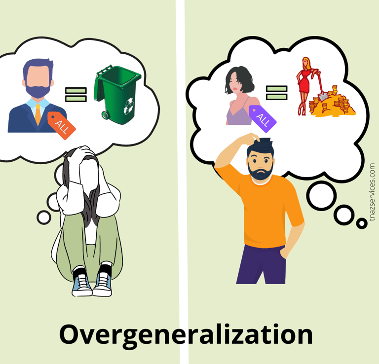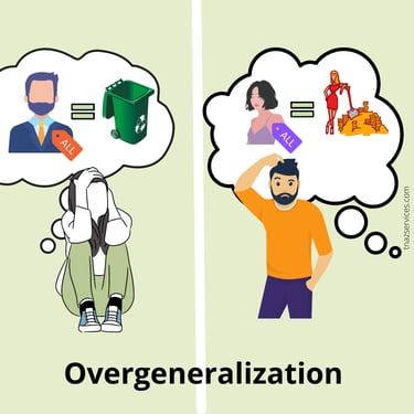 Overgeneralization is the process of taking a single negative event, a few occurrences, or specific instances and applying them to a much broader context. This can lead to skewed perceptions, biased judgments, and a distorted understanding of reality.