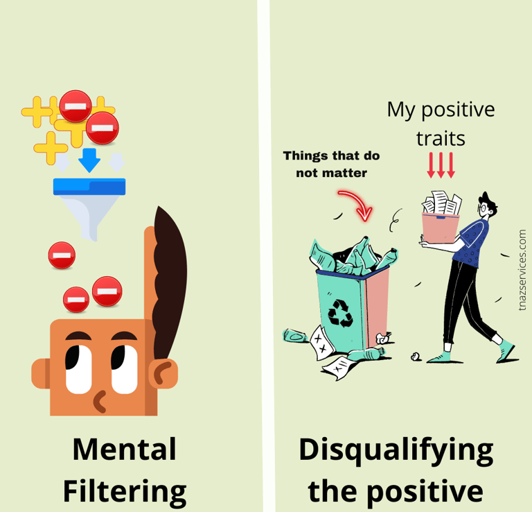 Both of these cognitive distortions can contribute to negative thought patterns, self-esteem issues, and an overall distorted perception of reality. Recognizing when you're engaging in mental filtering or disqualifying the positive is a crucial step toward developing a more balanced and realistic perspective. Learning to acknowledge both positive and negative aspects of situations and yourself helps foster healthier self-esteem and a more accurate understanding of your experiences.