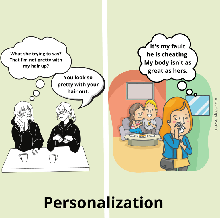 Both personalization and blaming can be detrimental to mental health and interpersonal relationships. Recognizing these cognitive distortions and challenging them with more rational and balanced thinking can help individuals develop healthier perspectives and responses to life's challenges. Cognitive-behavioral therapy (CBT) is one approach that can be effective in addressing and modifying these distortions.