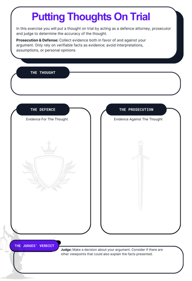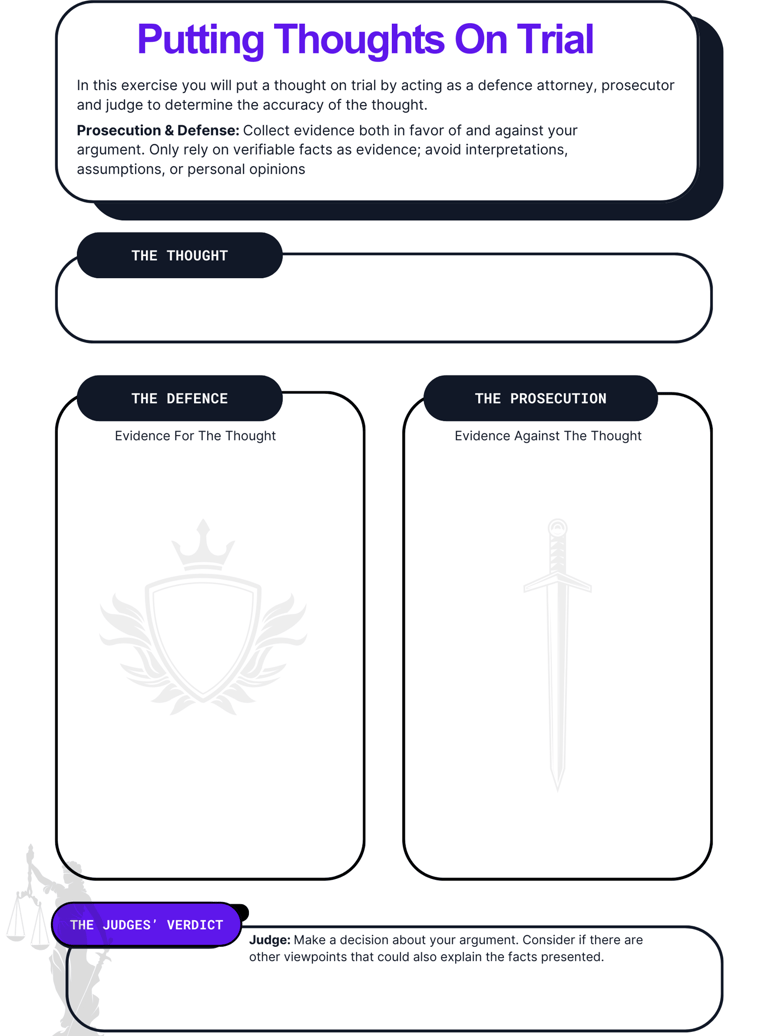 Imagine yourself as a lawyer, building a case for and against your thoughts. Gather evidence for both sides: